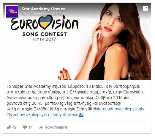 «Το Super Star Academy σήμερα Σάββατο, 13 Μαΐου, δεν θα προβληθεί, στα πλαίσια της υποστήριξης της Ελληνικής συμμετοχής στην Eurovision.