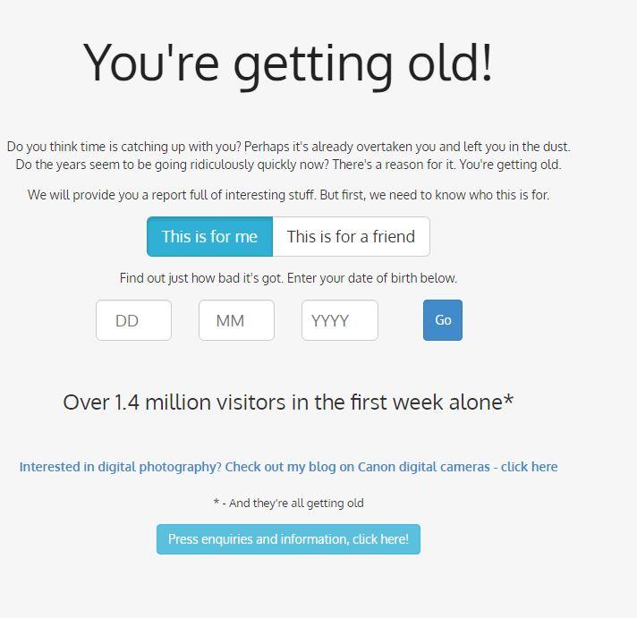 Το site you.regettingold.com παρέχει τη δυνατότητα στους χρήστες του διαδικτύου να γράψουν την ημερομήνια γέννησής τους και να μάθουν από το ζώδιό τους πόσα συνολικά κεράκια γενεθλίων έχουν σβήσει μέχρι σήμερα και ποσές φορές έχει χτυπησει η καρδιά τους.