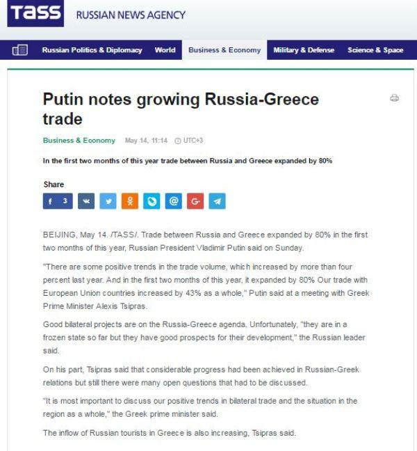 Σύμφωνα με το τηλεγράφημα, ο Βλαντιμίρ Πούτιν πρόσθεσε ότι «οι εμπορικές συναλλαγές μεταξύ Ρωσίας και Ελλάδας αυξήθηκαν κατά 80% τους πρώτους δύο μήνες του 2017. Υπάρχουν κάποιες θετικές τάσεις στον όγκο των εμπορικών συναλλαγών, οι οποίες αυξήθηκαν κατά περισσότερο από 4% το περασμένο έτος και στους δύο πρώτους μήνες του τρέχοντος έτους ενισχύθηκαν κατά 80%. Το εμπόριό μας με τις χώρες της Ευρωπαϊκής Ένωσης αυξήθηκε συνολικά κατά 43%».