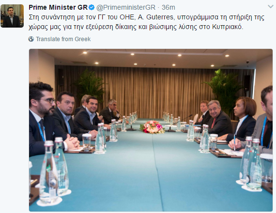 « Στη συνάντηση με τον ΓΓ του ΟΗΕ, A. Guterres, υπογράμμισα τη στήριξη της χώρας μας για την εξεύρεση δίκαιης και βιώσιμης λύσης στο Κυπριακό», έγραψε στο Twitter ο Πρωθυπουργός.