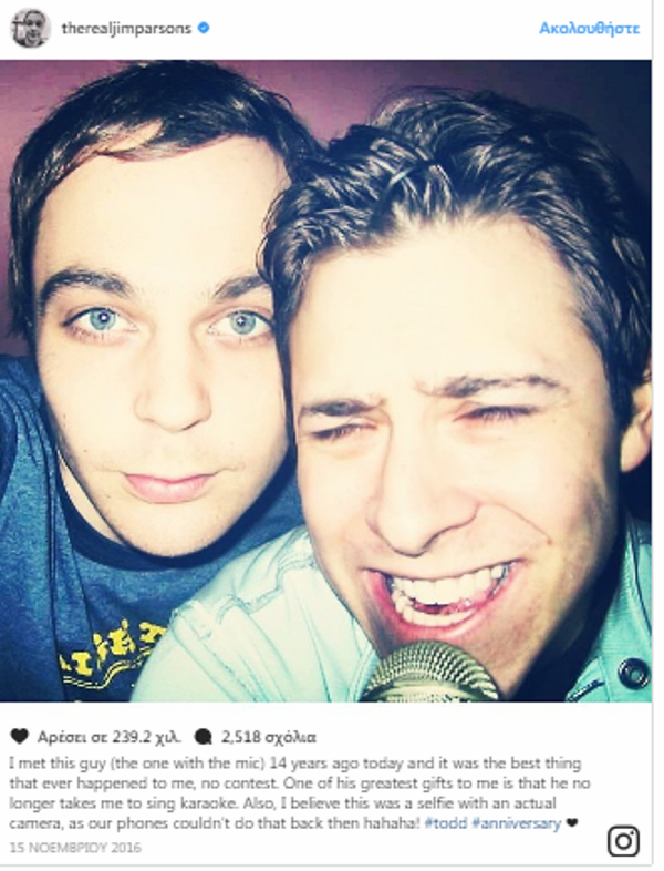 Ο Jim Parsons τον περασμένο Νοέμβριο, αναφερόμενος στον σύντροφό του μέσω μιας ανάρτησής του στο Instagram, είχε γράψει μεταξύ άλλων: «Γνώρισα αυτό τον άντρα σαν σήμερα πριν 14 χρόνια και είναι το καλύτερο πράγμα που μου έχει συμβεί στη ζωή μου».