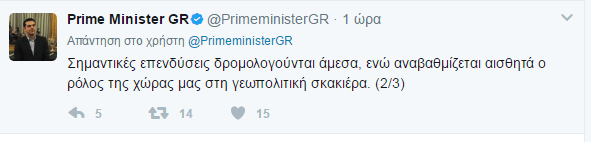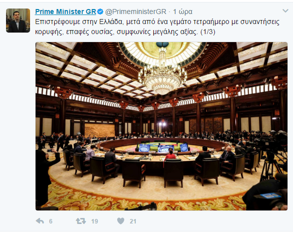 «Επιστρέφουμε στην Ελλάδα, μετά από ένα γεμάτο τετραήμερο με συναντήσεις κορυφής, επαφές ουσίας, συμφωνίες μεγάλης αξίας. Σημαντικές επενδύσεις δρομολογούνται άμεσα, ενώ αναβαθμίζεται αισθητά ο ρόλος της χώρας μας στη γεωπολιτική σκακιέρα.