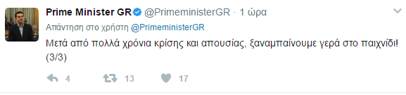 Μετά από πολλά χρόνια κρίσης και απουσίας, ξαναμπαίνουμε γερά στο παιχνίδι!», έγραψε στο Twitter ο Πρωθυπουργός,.