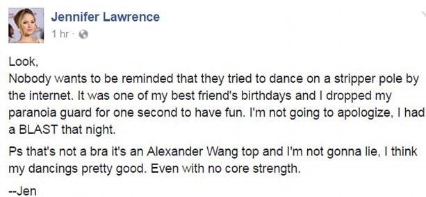 Το βίντεο, όπως ήταν φυσικό, έγινε viral, ωστόσο, κάθε άλλο παρά πτόησε την JLaw, η οποία με ανάρτησή της στο Facebook εμφανίστηκε… αμετανόητη.