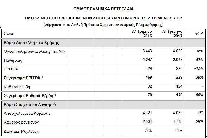 Ο Όμιλος ΕΛΛΗΝΙΚΑ ΠΕΤΡΕΛΑΙΑ ανακοίνωσε ισχυρά οικονομικά αποτελέσματα, σύμφωνα με ΔΠΧΠ, με τα Συγκρίσιμα Κέρδη EBITDA του Α’ Τριμήνου να ανέρχονται στα €229 εκατ., αυξημένα κατά 35% και τα Συγκρίσιμα Καθαρά Κέρδη στα €126 εκατ., αυξημένα κατά 80%, σε σχέση με το Α’ Τρίμηνο 2016. Τα διεθνή περιθώρια διύλισης παρέμειναν σε υψηλά επίπεδα και οι λειτουργικές επιδόσεις βελτιώθηκαν σε όλες τις δραστηριότητες του Ομίλου.