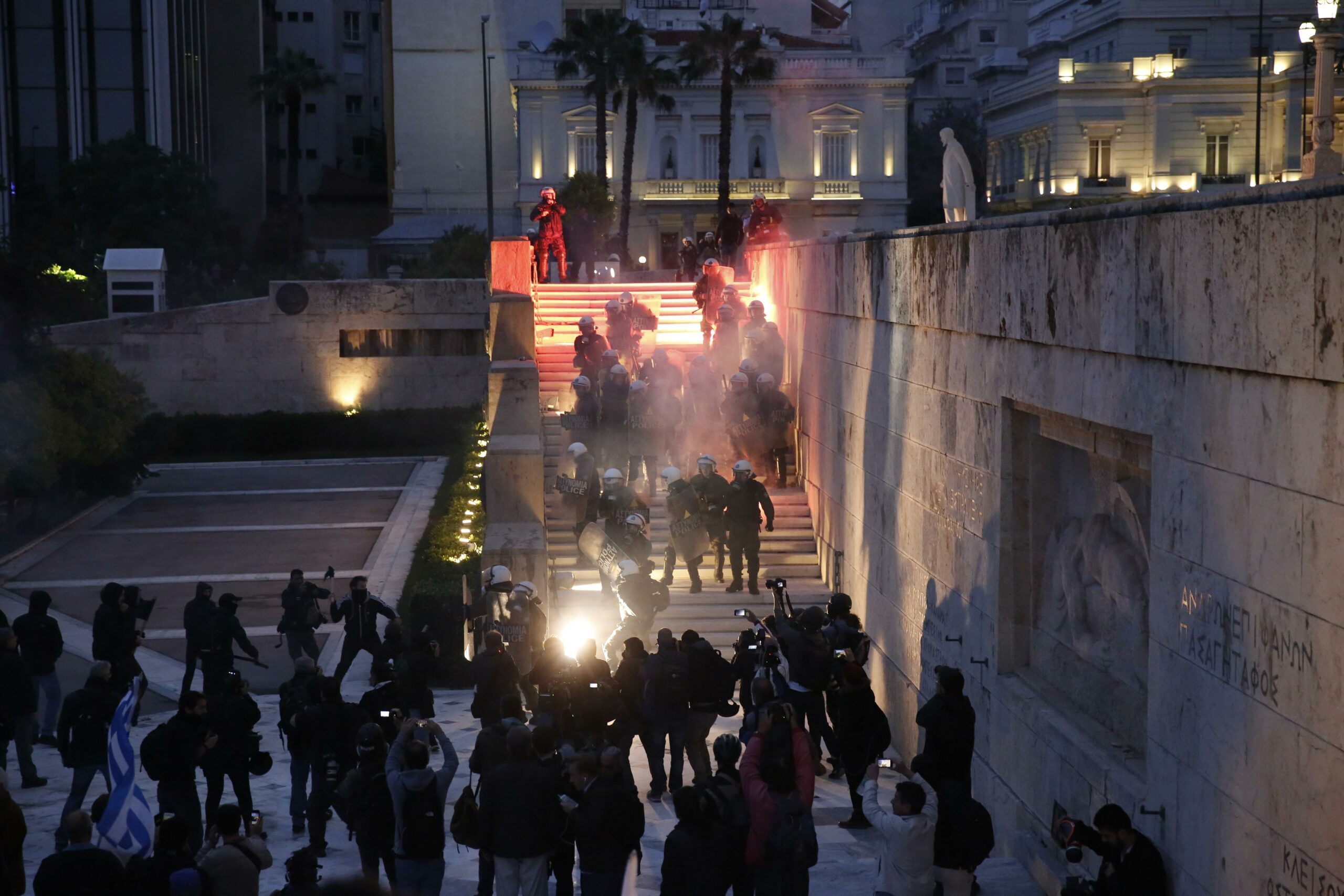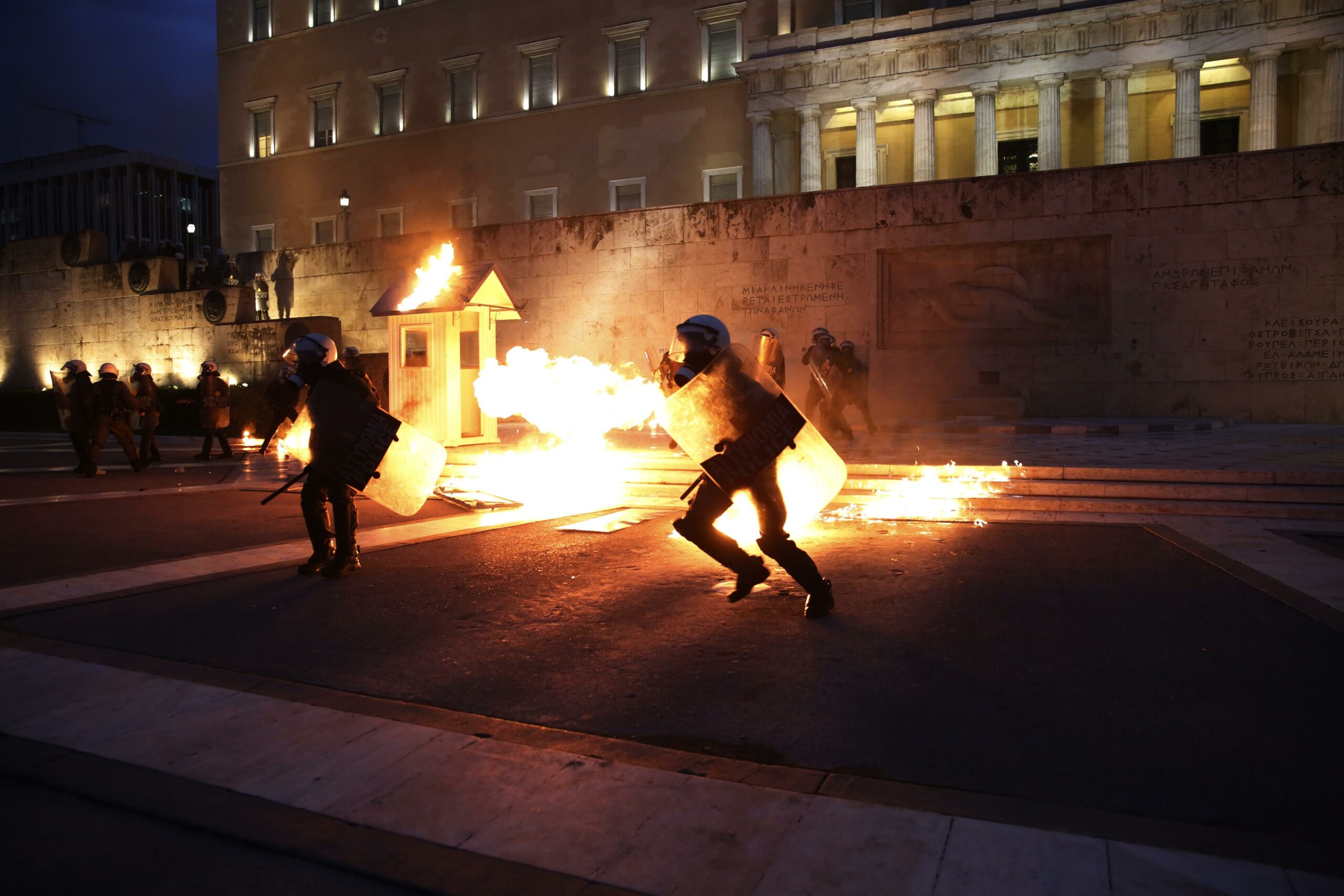 Δείτε φωτογραφίες από τα επεισόδια που γίνονται έξω από τη Βουλή στη διάρκεια της συζήτησης για την ψήφιση του πολυνομοσχεδίου.