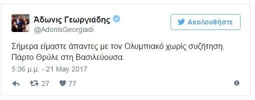 «Σήμερα είμαστε άπαντες με τον Ολυμπιακό χωρίς συζήτηση. Πάρτο Θρύλε στη Βασιλεύουσα» ήταν το μήνυμά του στο Twitter.
