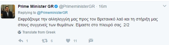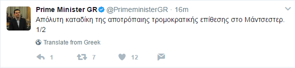 «Απόλυτη καταδίκη της αποτρόπαιης τρομοκρατικής επίθεσης στο Μάντσεστερ. Εκφράζουμε την αλληλεγγύη μας προς τον Βρετανικό λαό και τη στήριξη μας στους συγγενείς των θυμάτων. Είμαστε στο πλευρό σας.», έγραψε στο Twitter ο Αλέξης Τσίπρας