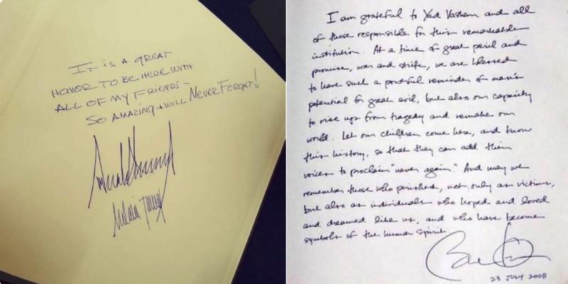 Κατ’ αντιπαραβολή, ο Μπαράκ Ομπάμα, στην επίσκεψή του στο Ισραήλ το 2013 είχε γράψει, μεταξύ άλλων: «Σε μια περίοδο μεγάλου κινδύνου και προσδοκίας, πόλεμου και αντιπαλότητας, είμαστε ευλογημένοι που έχουμε ένα τέτοιο ισχυρό μνημείο της ανθρώπινης δυνατότητας για μεγάλο κακό, αλλά και της δυνατότητάς μας να αναληφθούμε από την τραγωδία και να ξαναφτιάξουμε τον κόσμο μας. Ας φέρουμε τα παιδιά μας εδώ, ώστε να προσθέσουν τη φωνή τους για να διακηρύξουν “ποτέ ξανά”».