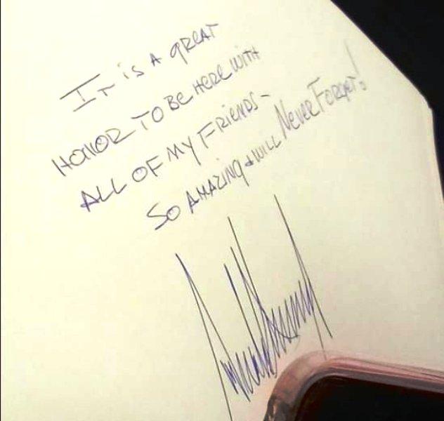 Αφού ξεναγήθηκε στο μουσείο, ο Τραμπ έγραψε και κάτι στο βιβλίο επισκεπτών. Κι αυτό που αποφάσισε να αφήσει ως μήνυμα ήταν: «Είναι μεγάλη τιμή να βρίσκομαι εδώ, με όλους τους φίλους μου. Τόσο θαυμάσιο, δεν θα το ξεχάσω ποτέ».
