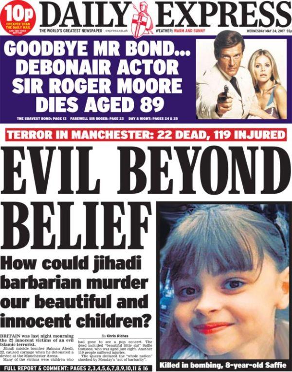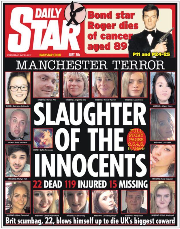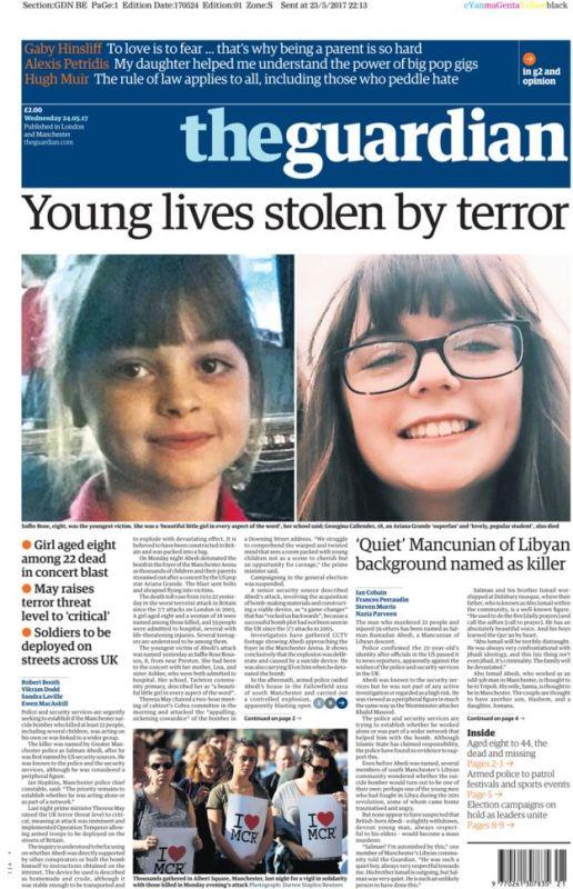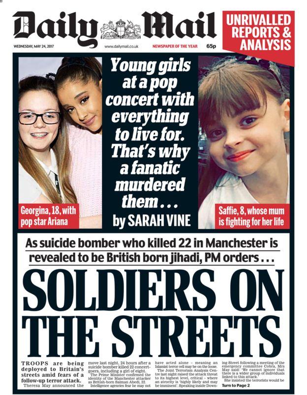 Η Daily Mail χαρακτηρίζει τον τρομοκράτη Σαλμάν Αμπέντι «γεννημένο στη Βρετανία τζιχαντιστή», η επίθεση αυτοκτονίας του οποίου οδήγησε στην απόφαση της πρωθυπουργού Τερέζα Μέι να «βγάλει το στρατό στους δρόμους»