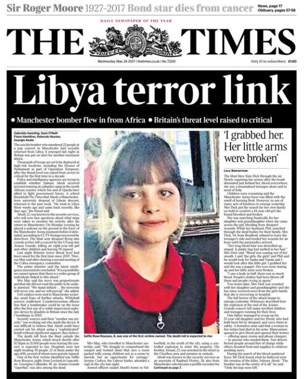 Οι Times αναδεικνύνουν τους δεσμούς του βομβιστή με τη Λιβύη, λέγοντας ότι ο Σαλμάν Αμπέντι επέστρεψε πρόσφατα απ’ τη βορειοαφρικανική χώρα κι ίσως εκπαιδεύτηκε εκεί.
