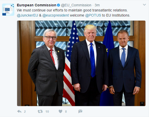 Τον Αμερικανό πρόεδρο Ντόναλντ Τραμπ υποδέχθηκαν σήμερα στις Βρυξέλλες ο πρόεδρος του Ευρωπαϊκού Συμβουλίου Ντόναλντ Τουσκ και ο πρόεδρος της Ευρωπαϊκής Επιτροπής Ζαν-Κλοντ Γιούνκερ κατά την πρώτη του συνάντηση με αξιωματούχους της Ευρωπαϊκής Ένωσης, την οποία έχει επικρίνει έντονα στο παρελθόν.