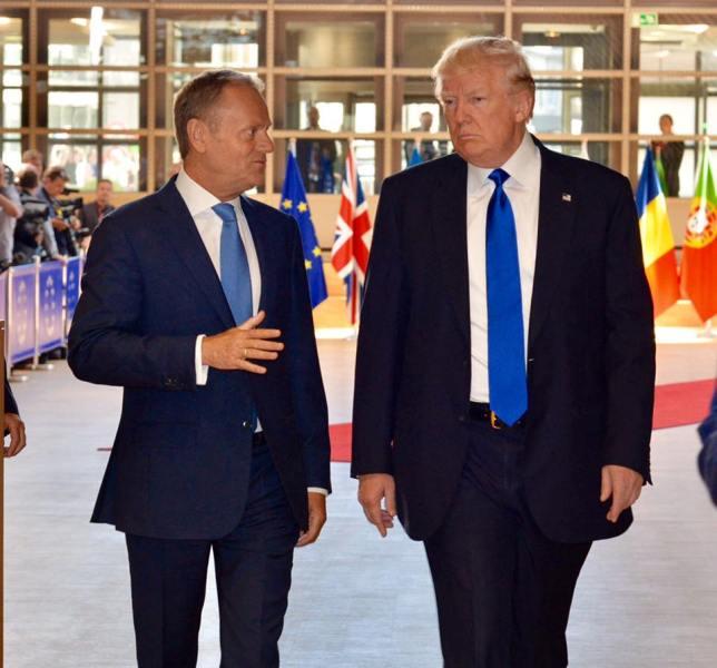 Τον Τραμπ, που έφτασε χθες Τετάρτη το βράδυ στις Βρυξέλλες, υποδέχθηκε σήμερα ο Τουσκ σε ένα κτίριο του Ευρωπαϊκού Συμβουλίου, στο οποίο έχουν υψωθεί αμερικανικές σημαίες δίπλα σε αυτή της ΕΕ και τις σημαίες των 28 χωρών μελών της Ένωσης.