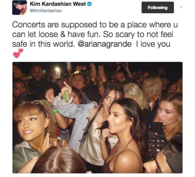 Στο -άκομψο, είναι αλήθεια- tweet της, η Κιμ Καρντάσιαν ανέβασε μια φωτογραφία της μαζί με την Γκράντε και έγραψε «Οι συναυλίες υποτίθεται ότι είναι ένα μέρος όπου μπορείς να χαλαρώσεις και να περάσεις καλά. Τόσο τρομακτικό να μη μπορείς να νοιώθεις ασφαλής σε αυτό τον κόσμο. Αριάνα Γκράντε, σε αγαπώ».