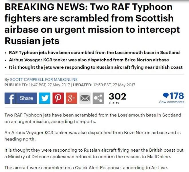 Τα δύο μαχητικά αεροσκάφη βρέθηκαν άμεσα στον αέρα, πραγματοποιώντας ταχεία απογείωση προκειμένου ν’ αντιδράσουν στην πτήση ρωσικού αεροσκάφους, το οποίο πετούσε κοντά στις ακτές της Βρετανίας, σύμφωνα με την εκτίμηση της εφημερίδας “The Daily Mail.”