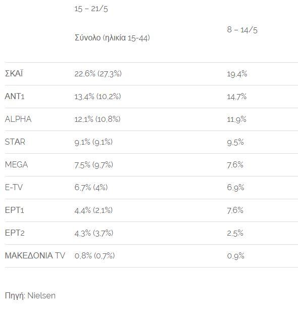 Από σήμερα η στήλη θα δημοσιεύει και τα ποσοστά της μέσης θεαματικότητας στην ηλικία από 15 έως 44 ετών, αφού σε αυτή στηρίζονται οι τηλεοπτικοί σταθμοί για την εμπορική τους πολιτική.
