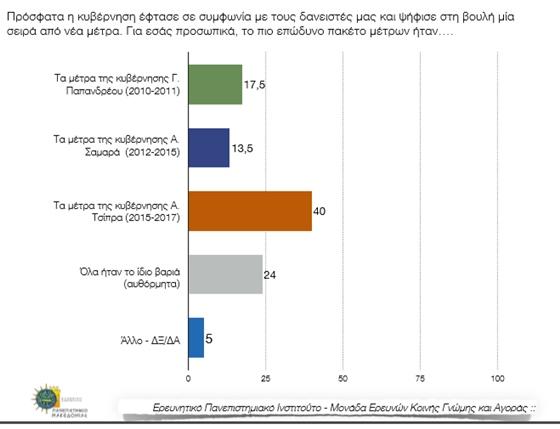 Το 40% των ερωτώμενων θεωρούν ότι τα προσφάτως ψηφισθέν από την κυβέρνηση πακέτο μέτρων είναι το πιο επώδυνο από τα μέτρα όλων των προηγούμενων κυβερνήσεων. 24% απαντούν αυθόρμητα ότι όλα ήταν το ίδιο βαριά, το 17,5% θεωρούν ότι πιο επώδυνα ήταν τα μέτρα της κυβέρνησης Παπανδρέου, το 13,5% ότι τα πιο σκληρά μέτρα ήταν της κυβέρνησης Σαμαρά, ενώ 5% δηλώνουν «δεν ξέρω/ δεν απαντώ».