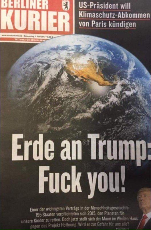 Το πιο λακωνικό και εύγλωττο πρωτοσέλιδο επέλεξε η γερμανική εφημερίδα Berliner Kurier για να σχολιάσει την απόφαση του Ντόναλντ Τραμπ να αποσύρει τις ΗΠΑ από την συμφωνία του Παρισιού για την κλιματική αλλαγή.