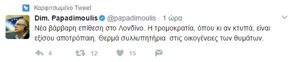 «Νέα βάρβαρη επίθεση στο Λονδίνο. Η τρομοκρατία, όπου κι αν χτυπά, είναι εξίσου αποτρόπαιη. Θερμά συλλυπητήρια στις οικογένειες των θυμάτων», γράφει σε ανάρτησή του στο twitter.