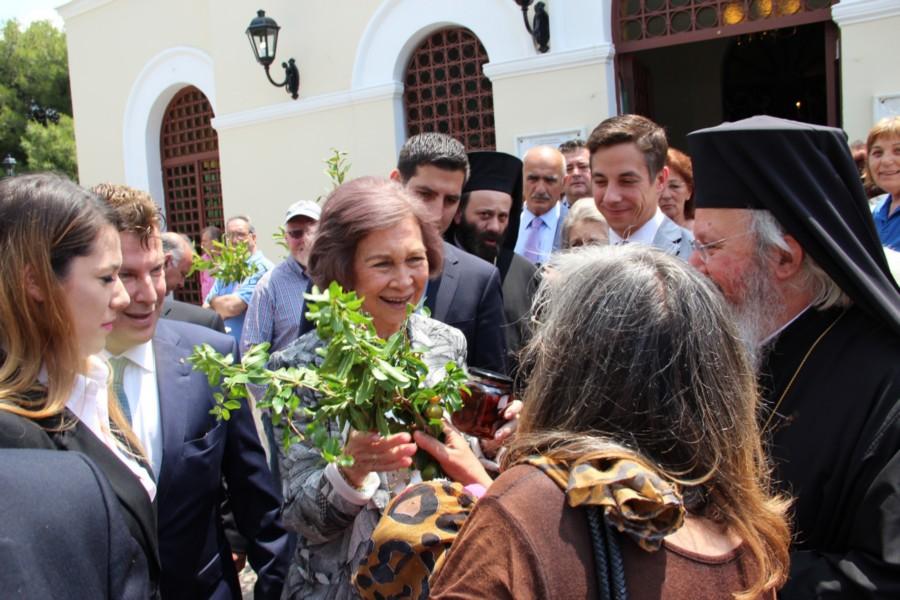 Τη βασίλισσα Σοφία, η οποία συνοδευόταν από την αδερφή της Ειρήνη, υποδέχθηκαν στα προπύλαια του ναού ο γενικός διευθυντής της Αποστολικής Διακονίας, Επίσκοπος Φαναρίου Αγαθάγγελος και ο Επίσκοπος Σαλώνων Αντώνιος με εκπροσώπους των τοπικών αρχών.