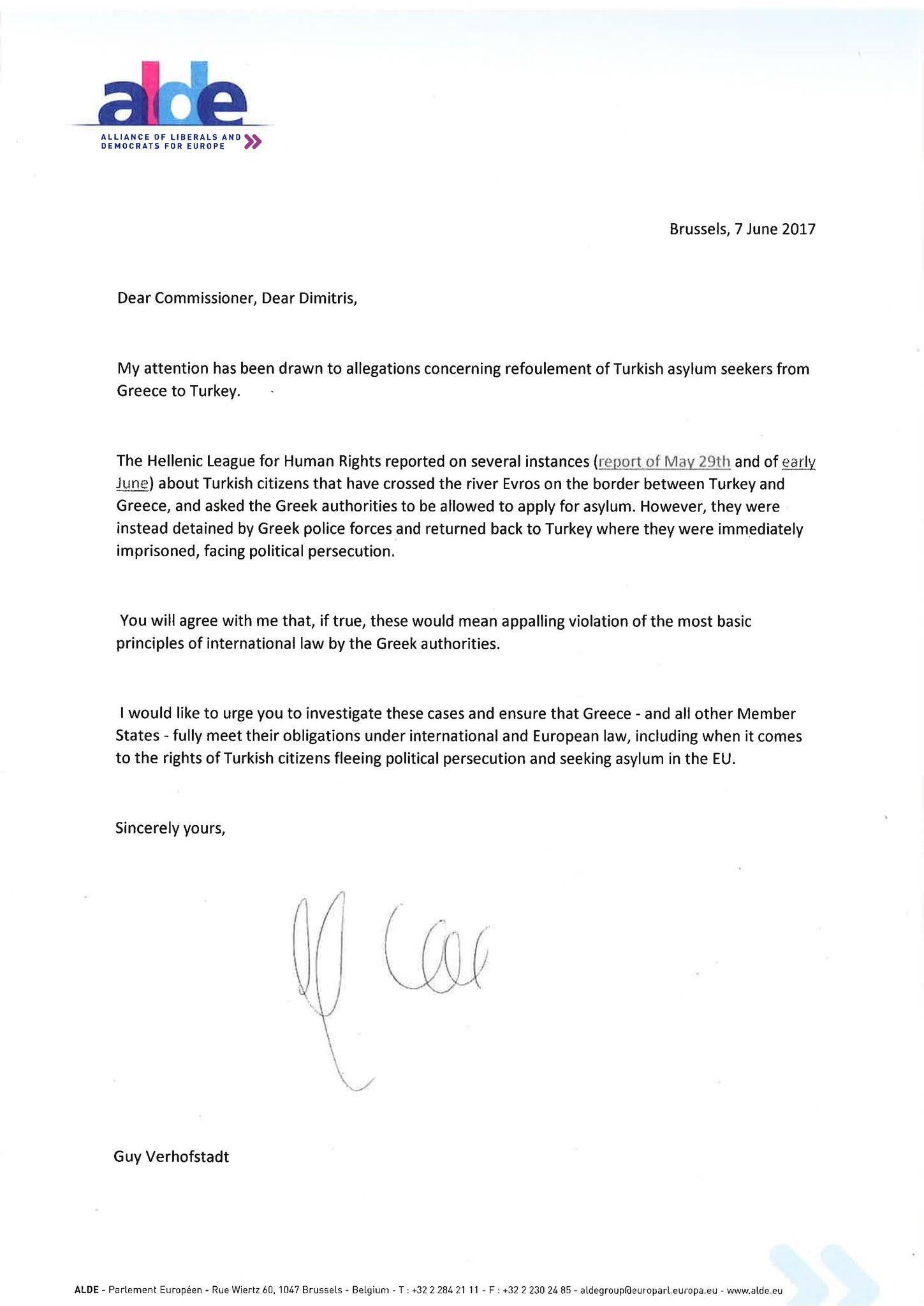 Επιστολή προς τον Έλληνα Ευρωπαίο Επίτροπο για τη Μετανάστευση, Εσωτερικών Υποθέσεων και Ιθαγένειας Δημήτρη Αβραμόπουλο, απέστειλε ο επικεφαλής της ευρωομάδας των Φιλελευθέρων Γκι Φέρχοφστατ αναφορικά με τις καταγγελίες για παράνομες επαναπροωθήσεις από την Ελλάδα στην Τουρκία.
