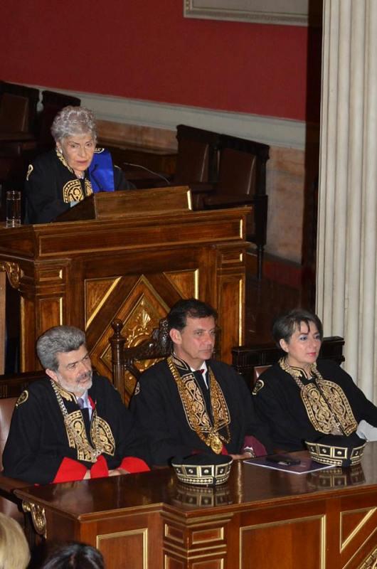 Ο Πρύτανης του Πανεπιστημίου Αθηνών, καθηγητής Μ.-Α. Δημόπουλος, κατά την προσφώνησή του, αναφέρθηκε, μεταξύ άλλων, στα ιδιαίτερα χαρίσματά της – την τολμηρή ως ανατρεπτική, αλλά εντυπωσιακά εναργή και πειστική χρήση της γλώσσας, την ευρηματικότητα των εικόνων της, την ικανότητά της να δημιουργεί ένταση με αφηρημένες λέξεις (συχνά δικής της επινόησης) – χαρίσματα, που, όπως τόνισε, έγιναν προοδευτικά όλο και πιο ορατά ήδη από την πρώτη φάση του έργου της.