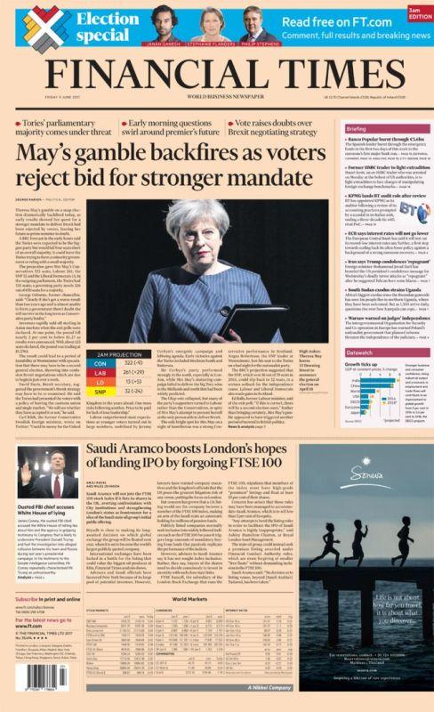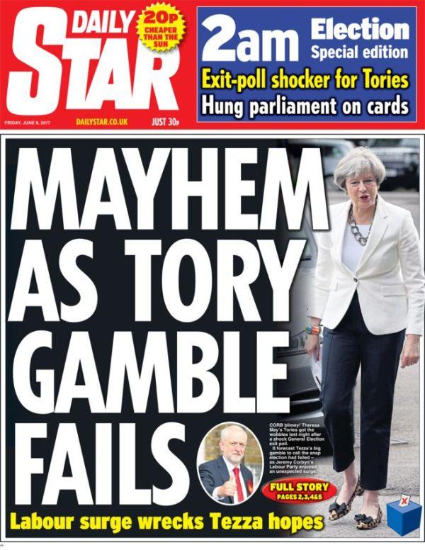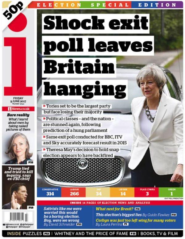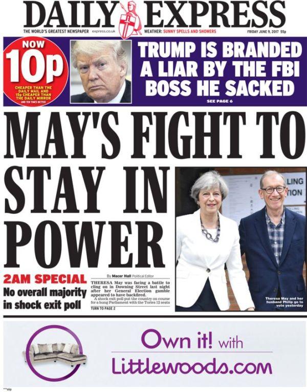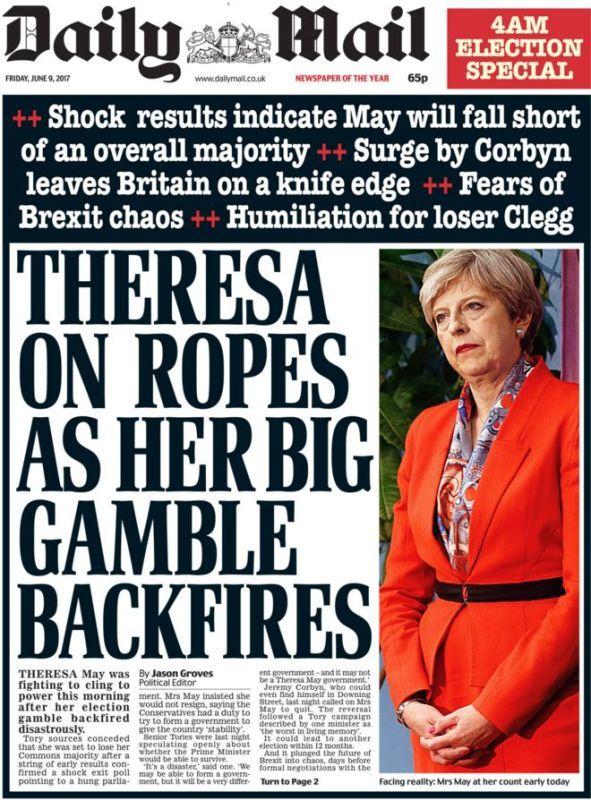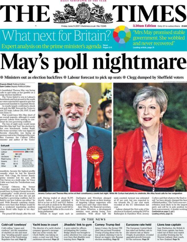Σε πύρρειο νίκη της Τερέζα Μει αναφέρονται τα πρωτοσέλιδα των πρωινών εφημερίδων στη Βρετανία, σχολιάζοντας τα πρώτα αποτελέσματα των exit polls λέγοντας πως η Βρετανή Πρωθυπουργός «δίνει μάχη για να κρατηθεί στην εξουσία».
