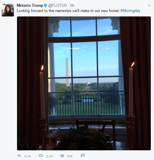 Η ίδια μέσα από ανάρτησή της στο Twitter ενημέρωσε πως «ανυπομονεί να δημιουργήσει αναμνήσεις από το νέο της σπίτι », και μαζί ανέβασε μια φωτογραφία από το μνημείο του Ουάσιγκτον όπως εκείνο φαίνεται από το Κόκκινο Δωμάτιο του Λευκού Οίκου.
