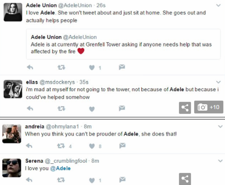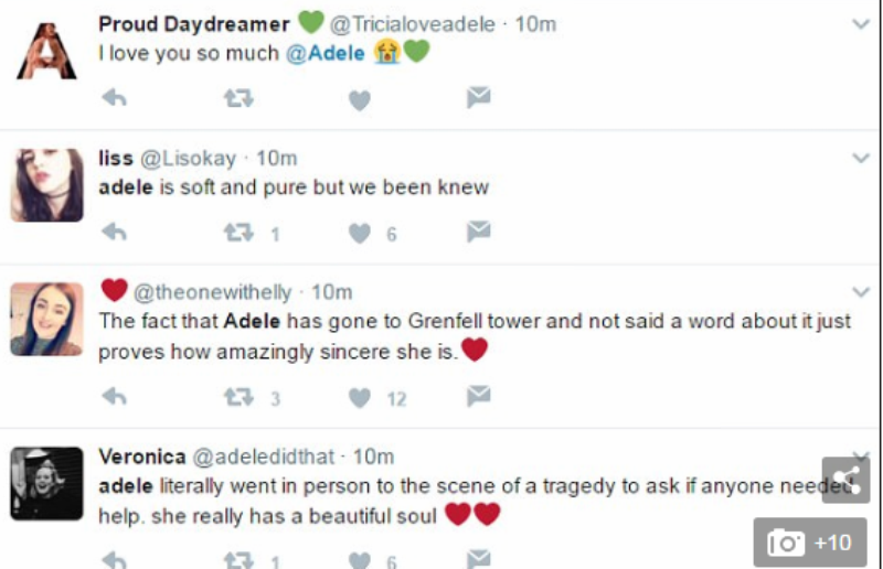 « Το γεγονός ότι η Adele έσπευσε στο σημείο και επέλεξε να εκφράσει τη θλίψη και τη συμπαράστασή της από κοντά, χωρίς να αρκεστεί σε ένα απλό, γραπτό μήνυμα συμπαράστασης, αποδεικνύει πόσο υπέροχος άνθρωπος είναι. Η Adele είναι ένας άγγελος με μεγάλη καρδιά. Είμαι τόσο περήφανη για εκείνη» ανέφερε ένα άλλο tweet.