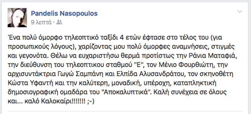 Την απάντηση αποφάσισε να δώσει ο ίδιος μέσα από μια ανάρτηση που έκανε στον προσωπικό του λογαριασμό στο Facebook, ανακοινώνοντας τη λήξη της συνεργασίας του με το κανάλι: «Ένα πολύ όμορφο τηλεοπτικό ταξίδι 4 ετών έφτασε στο τέλος του (για προσωπικούς λόγους), χαρίζοντας μου πολύ όμορφες αναμνήσεις, στιγμές και γεγονότα. Θέλω να ευχαριστήσω θερμά πρωτίστως τη Ράνια Ματαφιά, την διεύθυνση του τηλεοπτικού σταθμού “Ε”, τον Μένιο Φουρθιώτη, την αρχισυντάκτρια Γωγώ Σαμπάνη και Ελπίδα Αλυσανδράτου, τον σκηνοθέτη Κώστα Υφαντή και την καλύτερη, μοναδική, υπέροχη, καταπληκτική δημοσιογραφική ομαδάρα του “Αποκαλυπτικά”. Καλή συνέχεια σε όλους και… καλό Καλοκαίρι!!», έγραψε χαρακτηριστικά!