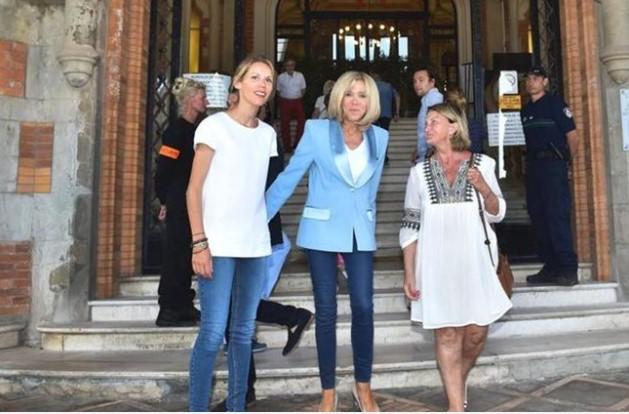 Μητέρα και κόρη επέλεξαν να ντυθούν αρμονικά και απλά, επιλέγοντας στενά τζιν, μπεζ γόβες και άσπρη μπλούζα. Η μοναδική διαφορά ήταν ότι η 64χρονη σύζυγος του Μακρόν φόρεσε από πάνω ένα γαλάζιο σακάκι.