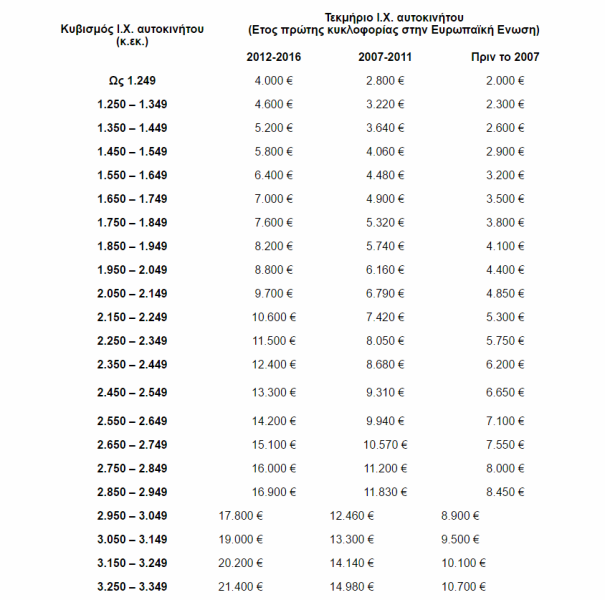 Τα παραπάνω ποσά μειώνονται ανάλογα με την παλαιότητα του αυτοκινήτου, η οποία υπολογίζεται από το έτος πρώτης κυκλοφορίας του στην Ελλάδα, κατά ποσοστό 30% για χρονικό διάστημα κυκλοφορίας πάνω από 5 και μέχρι 10 έτη και κατά ποσοστό 50% για χρονικό διάστημα πάνω από 10 έτη.