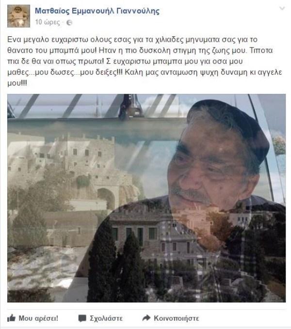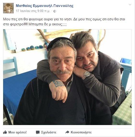 Ο λόγος για τον Ματθαίο Γιαννούλη, ο οποίος ανέβασε μια φωτογραφία του πατέρα του και έγραψε χαρακτηριστικά: «Μου πες ότι θα φύγουμε αύριο για το νησί. Δε μου πες όμως ότι εσύ θα ‘σαι στο φέρετρο!!!! Μπαμπά δε μ’ ακούς;;;;;».