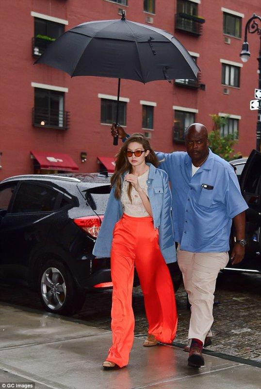 Ο λόγος για τη Τζίτζι Χαντίντ η οποία απ’ ότι φαίνεται όταν βρέχει, δεν αγχώνεται ιδιαίτερα καθώς έχει δίπλα της έναν βοηθό για να της κρατά την ομπρέλα!