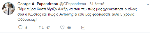 Στον προσωπικό του λογαριασμό έγραψε «Πάμε τώρα Καστελόριζο Αλέξη να σου πω πώς μας χρεοκόπησε ο φίλος σου ο Κώστας και πώς ο Αντώνης & εσύ μας φορτώσατε άλλα 5 χρόνια Οδύσσειας!»