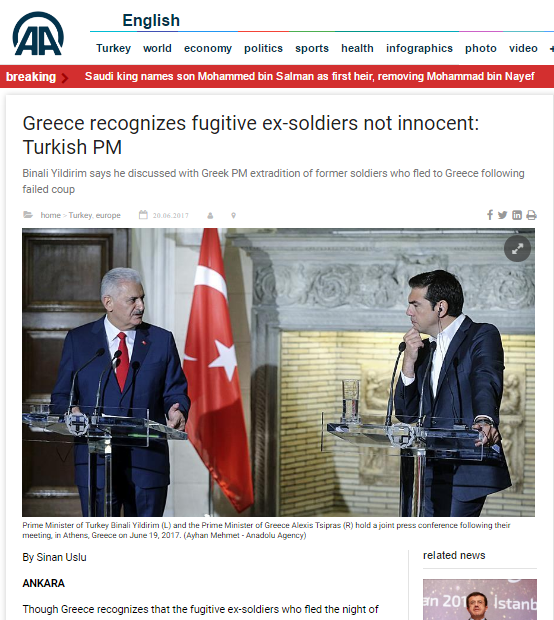 «Η Άγκυρα έχει επανειλημμένως ζητήσει την έκδοση των 8 Τούρκων αλλά τα ελληνικά δικαστήρια έχουν απορρίψει δύο φορές το αίτημα» σημειώνεται στη σχετική είδηση, όπου μάλιστα αναφέρεται πως ο Γιλντιριμ σημείωσε οτι η Ελλάδα, αντίθετα με άλλες χώρες, ήταν αντίθετη στην προσπάθεια πραξικοπήματος.