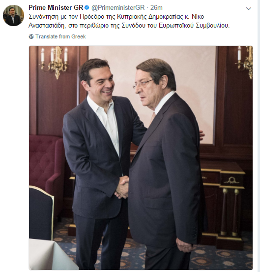Σύμφωνα με κυβερνητικές πηγές κατά τη συνάντηση τους, υπήρξε ενημέρωση του Έλληνα πρωθυπουργού προς τον Κύπριο Πρόεδρο για τη συνάντησή του με τον Τούρκο Πρωθυπουργό Μπιναλί Γιλντιρίμ κατά την πρόσφατη επίσκεψη του στην Αθήνας. Επιπλέον έγινε συζήτηση και αξιολόγηση επί του εγγράφου που κατέθεσε ο διαπραγματευτής του ΟΗΕ για το Κυπριακό Έσπεν Άιντε
