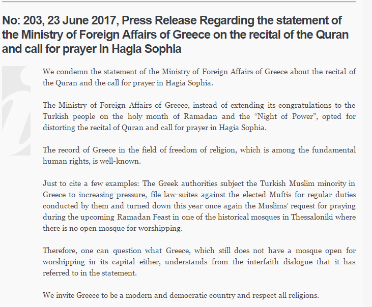 « Καταδικάζουμε τη δήλωση του υπουργείου Εξωτερικών της Ελλάδας για την απαγγελία του Κορανίου και το κάλεσμα για προσευχή στην Αγιά Σοφιά.