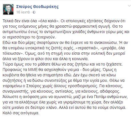 Άλλωστε η απόφαση μου να αγωνιστώ, μαζί με ένα Ποτάμι ανθρώπων, για να τα αλλάξουμε όλα χωρίς να γκρεμίσουμε τη χώρα, δεν αλλάζει ούτε μπαίνει σε δεύτερο πλάνο. Αλλά επί αυτού θα τα πούμε σύντομα.