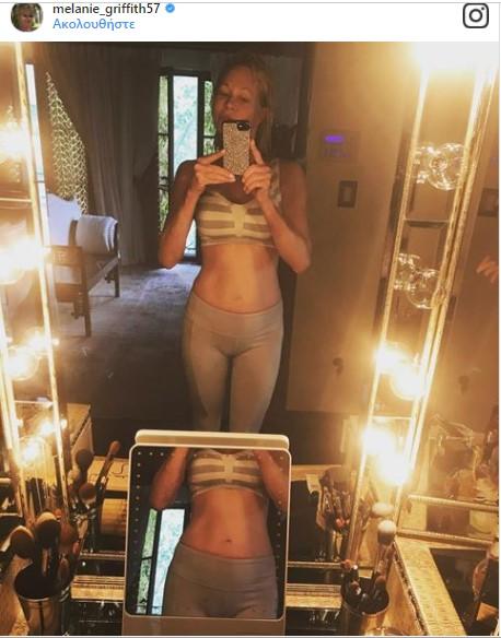 Φορώντας ένα αθλητικό μπουστάκι και κολάν, η Μέλανι Γκρίφιθ ποζάρει στον καθρέφτη και βγάζει μια selfie, είναι λίγα λεπτά πριν αρχίσει τη γυμναστική της.