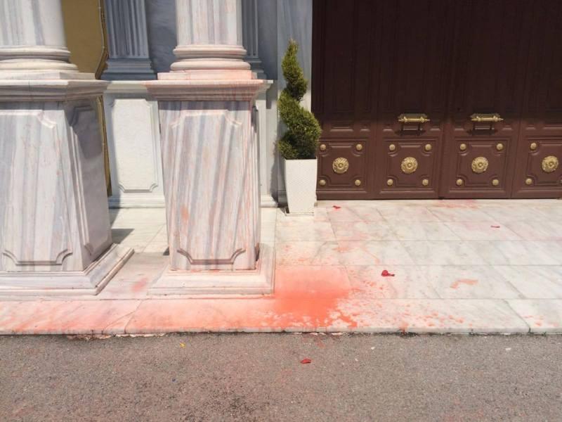 Με το που έφτασε η πορεία στο Γ΄ΣΣ, μερίδα διαδηλωτών πέταξε μπογιές στην είσοδο του Στρατηγείου.