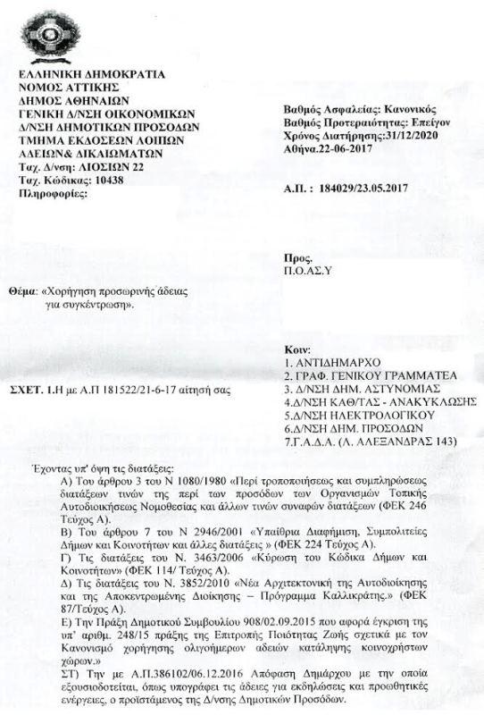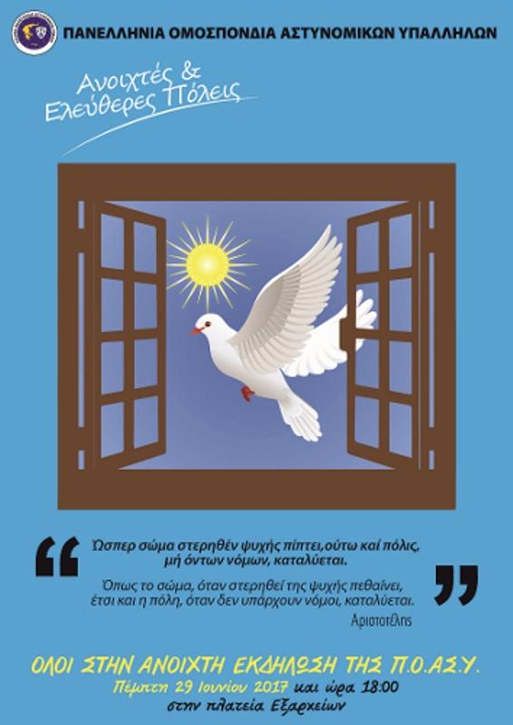 Με τη βούλα και την άδεια του Δήμου Αθηναίων οι συνδικαλιστές της ΕΛ.ΑΣ. θα πραγματοποιήσουν την εκδήλωσή τους στην πλατεία Εξαρχείων με θέμα «Ανοιχτές και Ελεύθερες Πόλεις» στις 29 Ιουνίου.