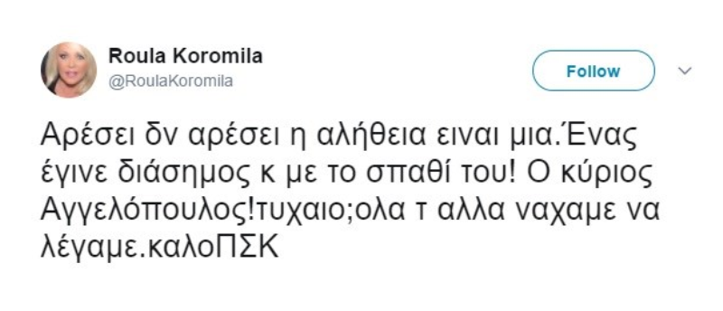 «Αρέσει δεν αρέσει η αλήθεια είναι μια. Ένας έγινε διάσημος κ με το σπαθί του! Ο κύριος Αγγελόπουλος! τυχαίο; όλα τα άλλα να ‘χαμε να λέγαμε. Καλό ΠΣΚ», έγραψε στο twitter.