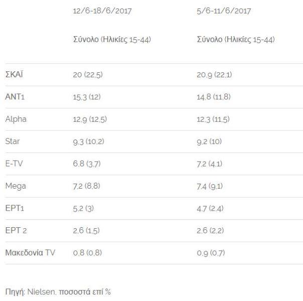 Ο ΑΝΤ1 με 15,3% δεν απειλείται από τον Alpha, ο οποίος έφτασε στο 12,9%, ενώ το Star προσέγγισε το 10%.