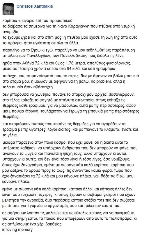 «Koρίτσια κι αγόρια, επί του προσωπικού. Τα διάβασα τα σημερινά για τη Νανά Καραγιάννη που πέθανε από νευρική ανορεξία. Το έχουμε ζήσει και στο σπίτι μας, η πεθερά μου έχασε τη ζωή της από αυτό το πράγμα. Ηταν υγιέστατη σε όλα τα άλλα.