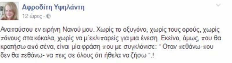 Η δημοσιογράφος Αφροδίτη Υψηλάντη στέλνει τον δικό της χαιρετισμό στη Νανά με μια ανάρτησή της στον προσωπικό της λογαριασμό στο facebook. Μια ανάρτηση που συγκλονίζει καθώς αποκαλύπτει τα τελευταία λόγια της Νανάς Καραγιάννη στην εγκάρδια φίλη της, λίγο καιρό πριν τον θάνατό της: