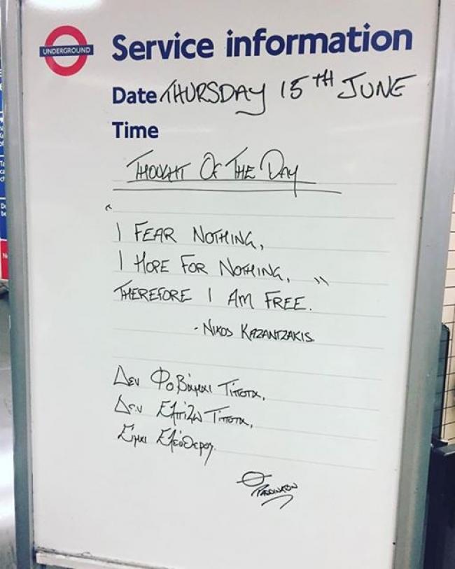 Κάθε λογής μηνύματα κατακλύζουν τους πίνακες και αρκετά από τα μηνύματα αυτά κατακλύζουν το διαδίκτυο. Έτσι την περασμένη εβδομάδα, το μετρό του Λονδίνου είχε ελληνικό «άρωμα».