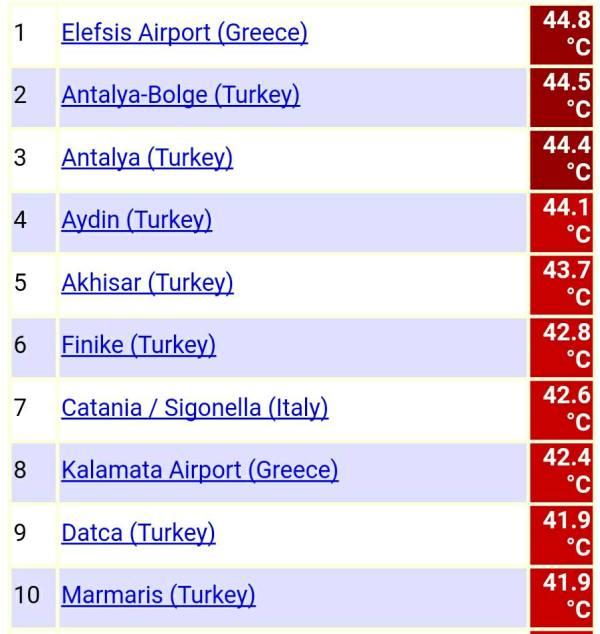 Στην υπόλοιπη Ελλάδα, σε πολλές περιοχές καταγράφηκαν θερμοκρασίες κοντά στους 43-44°C και τοπικά 45°C, που αλλού, στη Λάρισα! Σας επισυνάπτω 2 φωτογραφίες, η μία με τις μέγιστες σήμερα στην Ελλάδα και η άλλη με τις μέγιστες σήμερα στην Ευρώπη.