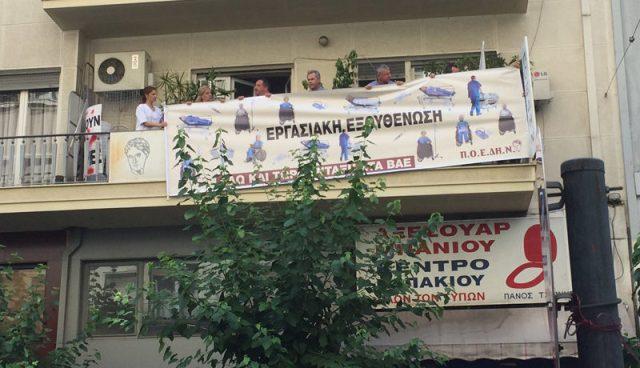 Εργασιακή εξουθένωση καταγγέλλουν τα μέλη της ΠΟΕΔΗΝ που άνοιξαν πανό στο απέναντι από το υπουργείο μπαλκόνι, όπου στεγάζονται τα γραφεία της.